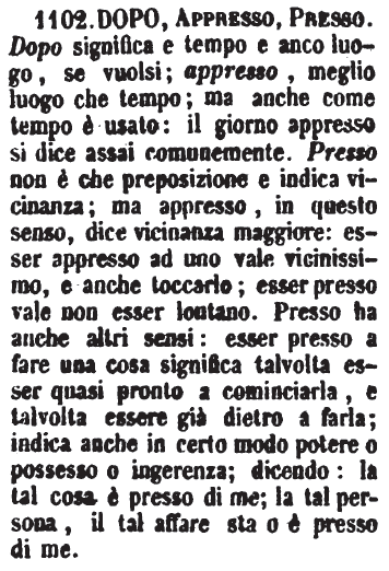 | Dopo, Appresso, Presso - Dopo significa e tempo e anco luogo, se vuolsi; appresso, meglio luogo che tempo; ma anche come tempo è usato: il giorno appresso si dice assai comunemente. Presso non è che preposizione e indica vicinanza; ma appresso, in questo senso, dice vicinanza maggiore: esser appresso ad uno vale vicinissimo, e anche toccarlo; esser presso vale non esser lontano. Presso ha anche altri sensi: esser presso a fare una cosa significa talvolta esser quasi pronto a cominciarla, e talvolta essere già dietro a farla; indica anche in certo modo potere o possesso o ingerenza; dicendo: la tal cosa è presso di me; la tal persona, il tal affare sta o è presso di me. [immagine] |