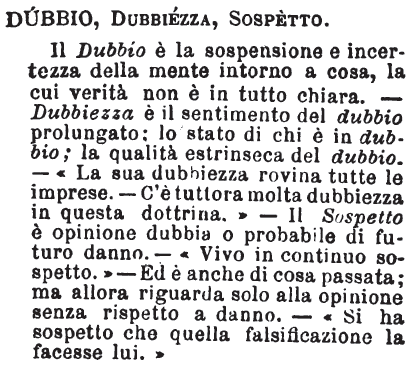 | Dubbio, Dubbiezza, Sospetto - Il Dubbio è la sospensione e incertezza della mente intorno a cosa, la cui verità non è in tutto chiara. - Dubbiezza è il sentimento del dubbio prolungato; lo stato di chi è in dubbio; la qualità estrinseca del dubbio. - «La sua dubbiezza rovina tutte le imprese. - C'è tuttora molta dubbiezza in questa dottrina.» Il Sospetto è opinione dubbia o probabile di futuro danno. - «Vivo in continuo sospetto.» - Ed è anche di cosa passata; ma allora riguarda solo alla opinione senza rispetto a danno. - «Si ha sospetto che quella falsificazione la facesse lui.» [immagine] |