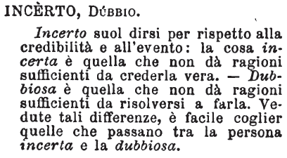 | Incerto, Dubbio - Incerto suol dirsi per rispetto alla credibilità e all'evento: la cosa incerta è quella che non dà ragioni sufficienti da crederla vera. - Dubbiosa è quella che non dà ragioni sufficienti da risolversi a farla. Vedute tali differenze, è facile coglier quelle che passano tra la persona incerta e la dubbiosa. [immagine] |