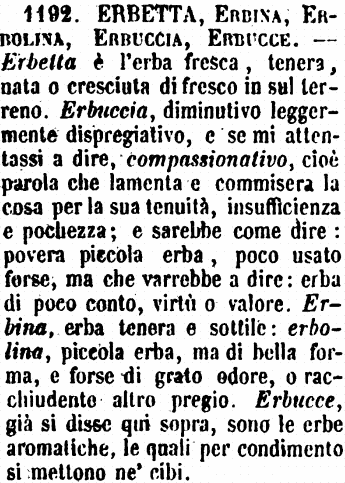 Erbetta, Erbina, Erbolina, Erbuccia, Erbucce - Erbetta è l'erba fresca, tenera, nata o cresciuta di fresco in sul terreno. Erbuccia, diminutivo leggermente dispregiativo, e se mi attentassi a dire, compassionativo, cioè parola che lamenta e commisera la cosa per la sua tenuità, insufficienza e pochezza; e sarebbe come dire: povera piccola erba, poco usato forse, ma che varrebbe a dire: erba di poco conto, virtù o valore. Erbina, erba tenera e sottile: erbolina, piccola erba, ma di bella forma, e forse di grato odore, o racchiudente altro pregio. Erbucce, già si disse qui sopra, sono le erbe aromatiche, le quali per condimento si mettono ne' cibi. [immagine]