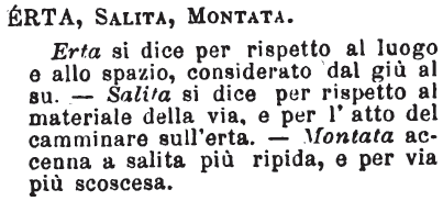 | Erta, Salita, Montata - Erta si dice per rispetto al luogo e allo spazio, considerato dal giù al su. - Salita si dice per rispetto al materiale della via, e per l'atto del camminare sull'erta. - Montata accenna a salita più ripida, e per via più scoscesa. [immagine] |