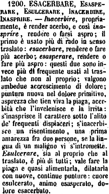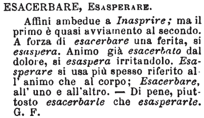 Esacerbare, Esasperare - Affini ambedue a Inasprire; ma il primo è quasi avviamento al secondo. A forza di esacerbare una ferita, si esaspera. Animo già esacerbato dal dolore, si esaspera irritandolo. Esasperare si usa più spesso riferito all'animo che al corpo; Esacerbare, all'uno e all'altro. - Di pene, piuttosto esacerbarle che esasperarle.