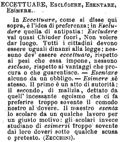 | Eccettuare, Escludere, Esentare, Esimere - In eccettuare, come si disse qui sopra, è l'idea di preferenza; in escludere quella di antipatia: escludere val quasi chiuder fuori, non volere dar luogo. Tutti i cittadini devono essere uguali dinanzi alla legge; nessuno dev'essere eccettuato rispetto ai pesi che essa impone; nessuno escluso, rispetto ai vantaggi che procura o che guarentisce. Esentare alcuno da un obbligo; esimerne se stesso: il primo è un atto di autorità; il secondo, di malizia, dettato da quell'incessante egoismo che ci fa preferire troppo sovente il comodo nostro al dovere. Il maestro esenta lo scolaro da un qualche lavoro per un giusto motivo: gli scolari invece studiano esimersi troppo sovente dai loro doveri sotto qualche scusa o pretesto. [immagine] |