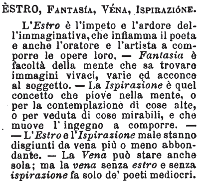 | Estro, Fantasia, Vena, Ispirazione - L'Estro è l'impeto e l'ardore dell'immaginativa, che infiamma il poeta e anche l'oratore e l'artista a comporre le opere loro. - Fantasia è facoltà della mente che sa trovare immagini vivaci, varie ed acconce al soggetto. - La Ispirazione è quel concetto che piove nella mente, o per la contemplazione di cose altre, o per veduta di cose mirabili, e che muove l'ingegno a comporre. - L'Estro e l'Ispirazione male stanno disgiunti da vena più o meno abbondante. - La Vena può stare anche sola; ma la vena senza estro e senza ispirazione fa solo de' poeti mediocri. [immagine] |