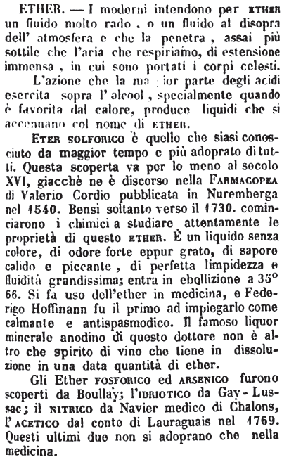 L'azione che la maggior parte degli acidi esercita sopra l'alcool, specialmente quando è favorita dal calore, produce liquidi che si accennano col nome di ether. Eter solforico è quello che siasi conosciuto da maggior tempo e più adoprato di tutti. Questa scoperta va per lo meno al secolo XVI, giacchè ne è discorso nella Farmacopea di Valerio Cordio pubblicata in Nuremberga nel 1540. Bensì soltanto verso il 1730. cominciarono i chimici a studiare attentamente le proprietà di questo ether. E' un liquido senza colore, di odore forte eppur grato, di sapore calido e piccante, di perfetta limpidezza e fluidità grandissima; entra in ebollizione a 35° 66. Si fa uso dell'ether in medicina, e Federigo Hoffinann fu il primo ad impiegarlo come calmante e antispasmodico. Il famoso liquor minerale anodino di questo dottore non è altro che spirito di vino che tiene in dissoluzione in una data quantità di ether. Gli Ether fosforico ed arsenico furono scoperti da Boullay; l'idriotico da Gay-Lussac; il nitrico da Navier medico di Chalons, l'acetico dal conte di Lauraguais nel 1769. Questi ultimi due non si adoprano che nella medicina. [immagine] |