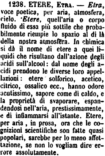 | Etere, Etra - Etra, voce poetica, per aria, atmosfera, cielo. Etere, quell'aria o corpo fluido di essa più sottile che probabilmente riempie lo spazio al di là della nostra atmosfera. In chimica si dà il nome di etere a quei liquidi che risultano dall'azione degli acidi sull'alcool: dal nome degli acidi prendono le diverse loro appellazioni: etere solforico, acetico, citrico, ossalico ecc., hanno odore acutissimo, sapore come di caldo, e la proprietà di svaporare, espandendosi nell'aria, prestissimamente, e di infiammarsi all'istante. Etere, per aria, in prosa, ora che le cognizioni scientifiche son fatte quasi popolari, sarebbe per lo meno affettazione, se non lo vogliam dire errore assolutamente. [immagine] |