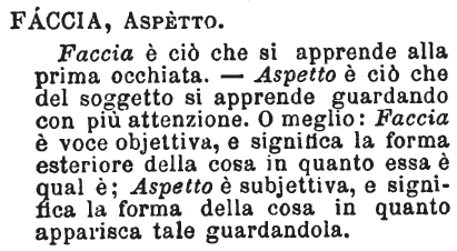 | Faccia, Aspetto - Faccia è ciò che si apprende alla prima occhiata. - Aspetto è ciò che del soggetto si apprende guardando con più attenzione. O meglio: Faccia è voce objettiva, e significa la forma esteriore della cosa in quanto essa è qual è; Aspetto è subjettiva, e significa la forma della cosa in quanto apparisca tale guardandola. [immagine] |