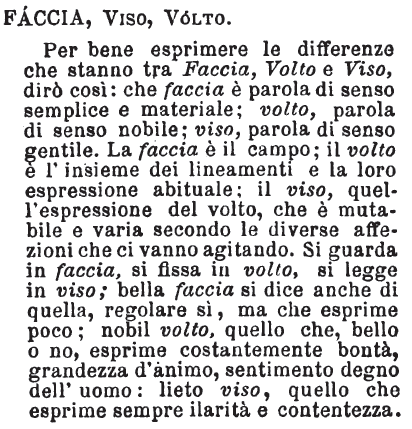 | Faccia, Viso, Volto - Per bene esprimere le differenze che stanno tra Faccia, Volto e Viso, dirò così: che faccia è parola di senso semplice e materiale; volto, parola di senso nobile; viso, parola di senso gentile.