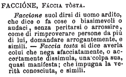 | Faccione, Faccia tosta - Faccione suol dirsi di uomo ardito, che dice o fa cose o biasimevoli o audaci, senza peritarsi o arrossire, come di rimproverare persone da più di lui, domandare arrogantemente, e simili. - Faccia tosta si dice averla colui che nega sfacciatamente, o accortamente dissimula, una colpa sua, quasi manifesta; che impugna la verità conosciuta, e simili. [immagine] |