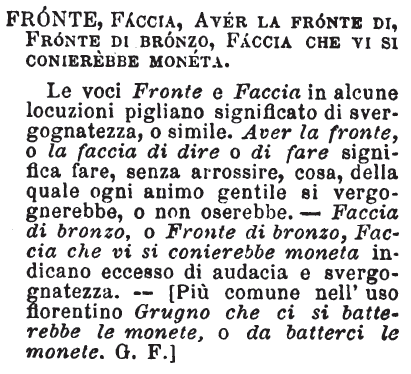 | Fronte, Faccia, Aver la fronte di, Fronte di bronzo, Faccia che vi si conierebbe moneta - Le voci Fronte e Faccia in alcune locuzioni pigliano significato di svergognatezza, o simile. Aver la fronte, o la faccia di dire o di fare significa fare, senza arrossire, cosa, della quale ogni animo gentile si vergognerebbe, o non oserebbe. - Faccia di bronzo, o Fronte di bronzo, Faccia che vi si conierebbe moneta indicano eccesso di audacia e svergognatezza. - [Più comune nell'uso fiorentino Grugno che ci si batterebbe le monete, o da batterci le monete. G. F.] [immagine] |