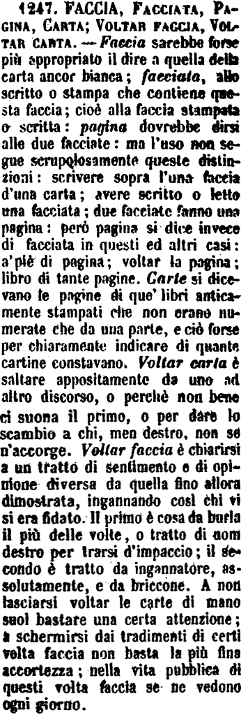 | Faccia, Facciata, Pagina, Carta; Voltar faccia, Voltar carta - Faccia sarebbe forse più appropriato il dire a quella della carta ancor bianca; facciata, allo scritto o stampa che contiene questa faccia; cioè alla faccia stampata o scritta: pagina dovrebbe dirsi alle due facciate: ma l'uso non segue scrupolosamente queste distinzioni: scrivere sopra l'una faccia d'una carta; avere scritto o letto una facciata; due facciate fanno una pagina: però pagina si dice invece di facciata in questi ed altri casi: a' piè di pagina; voltar la pagina; libro di tante pagine. Carte si dicevano le pagine di que' libri anticamente stampati che non erano numerate che da una parte, e ciò forse per chiaramente indicare di quante cartine constavano. Voltar carta è saltare appositamente da uno ad altro discorso, o perchè non bene ci suona il primo, o per dare lo scambio a chi, men destro, non se n'accorge. Voltar faccia è chiarirsi a un tratto di sentimento o di opinione diversa da quella fino allora dimostrata, ingannando così chi vi si era fidato. Il primo è cosa da burla il più delle volte, o tratto di uom destro per trarsi d'impaccio; il secondo è tratto da ingannatore, assolutamente, e da briccone. A non lasciarsi voltar le carte di mano suol bastare una certa attenzione; a schermirsi dai tradimenti di certi volta faccia non basta la più fina accortezza; nella vita pubblica di questi volta faccia se ne vedono ogni giorno. [immagine] |