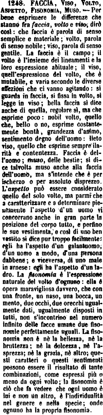 La faccia è il campo; il volto è l'insieme dei lineamenti e la loro espressione abituale; il viso, quell' espessione del volto, che è mutabile e varia secondo le diverse affezioni che ci vanno agitando. Si guarda in faccia, si fissa in volto, si legge in viso; bella faccia si dice anche di quella, regolare sì, ma che esprime poco; nobil volto, quello che, bello o no, esprime costantemete bontà, grandezza d'animo, sentimento degno dell'uomo: lieto viso, quello che esprime sempre ilarità e contentezza. [immagine] |