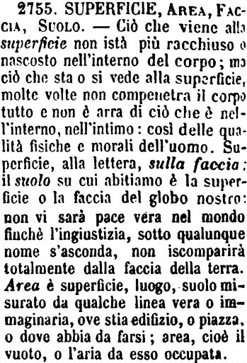 | Superficie, Area, Faccia, Suolo - Ciò che viene alla superficie non istà più racchiuso o nascosto nell'interno del corpo; ma ciò che sta o si vede alla superficie, molte volte non compenetra il corpo tutto e non è arra di ciò che è nell'interno, nell'intimo: così delle qualità fisiche e morali dell'uomo. Superficie, alla lettera, sulla faccia: il suolo su cui abitiamo è la superficie o la faccia del globo nostro: non vi sarà pace vera nel mondo finchè l'ingiustizia, sotto qualunque nome s'asconda, non iscomparirà totalmente dalla faccia della terra. Area è superficie, luogo, suolo misurato da qualche linea vera o immaginaria, ove stia edifizio, o piazza, o dove abbia da farsi; area, cioè il vuoto, o l'aria da esso occupata. [immagine] |