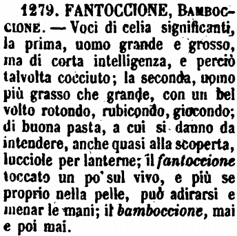 Fantoccione, Bamboccione - Voci di celia significanti, la prima, uomo grande e grosso, ma di corta intelligenza, e perciò talvolta cocciuto; la seconda, uomo più grasso che grande, con un bel volto rotondo, rubicondo, giocondo; di buona pasta, a cui si danno da intendere, anche quasi alla scoperta, lucciole per lanterne; il fantoccione toccato un po' sul vivo, e più se proprio nella pelle, può adirarsi e menar le mani; il bamboccione, mai e poi mai. [immagine]