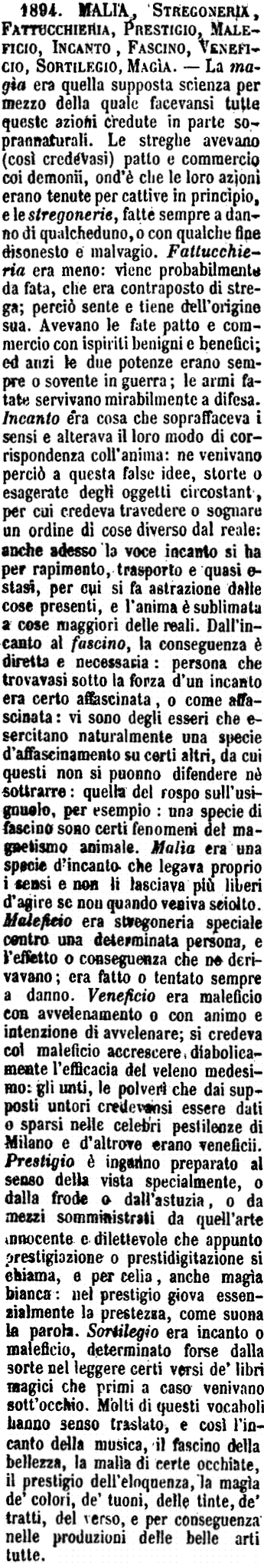 | Malia, Stregoneria, Fattucchieria, Prestigio, Maleficio, Incanto, Fascino, Veneficio, Sortilegio, Magia - La magìa era quella supposta scienza per mezzo della quale facevansi tutte queste azioni credute in parte soprannaturali. Le streghe avevano (così credevasi) patto e commercio coi demonii, ond'è che le loro azioni erano tenute per cattive in principio, e le stregonerie, fatte sempre a danno di qualcheduno, o con qualche fine disonesto e malvagio. Fattucchieria era meno: viene probabilmente da fata, che era contraposto di strega; perciò sente e tiene dell'origine sua. Avevano le fate patto e commercio con ispiriti benigni e benefici; ed anzi le due potenze erano sempre o sovente in guerra; le armi fatate servivano mirabilmente a difesa. Incanto era cosa che sopraffaceva i sensi e alterava il loro modo di corrispondenza coll'anima: ne venivano perciò a questa false idee, storte o esagerate degli oggetti circostanti, per cui credeva travedere o sognare un ordine di cose diverso dal reale: anche adesso la voce incanto si ha per rapimento, trasporto e quasi estasi, per cui si fa astrazione dalle cose presenti, e l'anima è sublimata a cose maggiori delle reali. Dall'incanto al fascino, la conseguenza è diretta e necessaria: persona che trovavasi sotto la forza d'un incanto era certo affascinata, o come affascinata: vi sono degli esseri che esercitano naturalmente una specie d'affascinamento su certi altri, da cui questi non si puonno difendere nè sottrarre: quella del rospo sull'usignuolo, per esempio: una specie di fascino sono certi fenomeni del magnetismo animale. Malìa era una specie d'incanto che legava proprio i sensi e non li lasciava più liberi d'agire se non quando veniva sciolto. Maleficio era stregoneria speciale contro una determinata persona, e l'effetto o conseguenza che ne derivavano; era fatto o tentato sempre a danno. Veneficio era maleficio con avvelenamento o con animo e intenzione di avvelelnare; si credeva col maleficio accrescere diabolicamente l'efficacia del veleno medesimo: gli unti, le polveri che dai supposti untori credevansi essere dati o sparsi nelle celebri pestilenze di Milano e d'altrove erano veneficii. Prestigio è inganno preparato al senso della vista specialmente, o dalla frode o dall'astuzia, o da mezzi somministrati da quell'arte innocente e dilettevole che appunto prestigiazione o prestidigitazione si chiama, e per celia, anche magìa bianca: nel prestigio giova essenzialmente la prestezza, come suona la parola. Sortilegio era incanto o maleficio, determinato forse dalla sorte nel leggere certi versi de' libri magici che primi a caso venivano sott'occhio. Molti di questi vocaboli hanno senso traslato, e così l'incanto della musica, il fascino della bellezza, la malìa di certe occhiate, il prestigio dell'eloquenza, la magìa de' colori, de' tuoni, delle tinte, de' tratti, del verso, e per conseguenza nelle produzioni delle belle arti tutte. [immagine] |