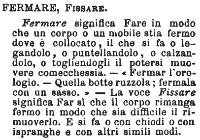 | Fermare, Fissare - Fermare significa Fare in modo che un corpo o un mobile stia fermo dove è collocato, il che si fa o legandolo, o puntellandolo, o calzandolo, o togliendogli il potersi muovere comecchessia. - «Fermar l'orologio. - Quella botte ruzzola; fermala con un sasso.» - La voce Fissare significa Far si che il corpo rimanga fermo in modo che sia difficile il rimuoverlo. E si fa o con chiodi o con ispranghe e con altri simili modi. [immagine] |