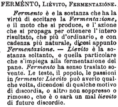 | Fermento, Lievito, Fermentazione - Fermento è e la sostanza che ha la virtù di eccitare la fermentazione, e il moto che si produce, e l'azione che si propaga per ottenere l'intero risultato, che più d'ordinario e con cadenza più naturale dicesi appunto fermentazione. Lievito è la sostanza soltanto, e quella particolare che s'impiega alla fermentazione del pane. Fermento ha senso traslato sovente: le teste, il popolo, le passioni in fermento: lievito può averlo qualche volta, dicendosi di qualche motivo di discordia o altro non soppresso o rimosso, che è o sarà un mal lievito di future discordie. [immagine] |