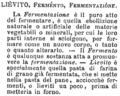 | Lievito, Fermento, Fermentazione - La Fermentazione è il puro atto del fermentare, è quella ebollizione naturale o artificiale delle materie vegetabili o minerali, per cui le loro parti interne si sciolgono, per formare come un nuovo corpo, o tanto o quanto alterarlo. - Il Fermento è qualunque sostanza atta a promuovere la fermentazione. - Lievito è specialmente quella pasta di farina di grano già fermentata, che si mette nella pasta del pane, acciochè fermenti, o lieviti un poco, prima di metterla in forno. [immagine] |