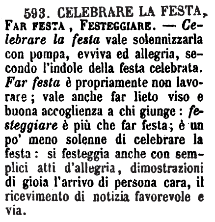 | Celebrare la festa, Far festa, Festeggiare - Celebrare la festa vale solennizzarla con pompa, evviva ed allegria, secondo l'indole della festa celebrata. Far festa è propriamente non lavorare; vale anche far lieto viso e buona accoglienza a chi giunge: festeggiare è più che far festa; è un po' meno solenne di celebrare la festa: si festeggia anche con semplici atti d'allegria, dimostrazioni di gioia l'arrivo di persona cara, il ricevimento di notizia favorevole e via. [immagine] |