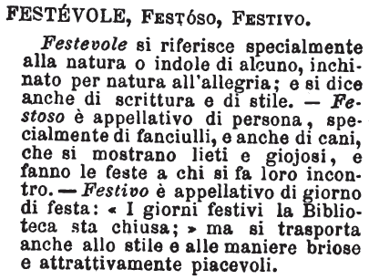 Festevole, Festoso, Festivo - Festevole si riferisce specialmente alla natura o indole di alcuno, inchinato per natura all'allegria; e si dice anche di scrittura e di stile, - Festoso è appellativo di persona, specialmente di fanciulli, e anche di cani, che si mostrano lieti e giojosi, e fanno le feste a chi si fa loro incontro. - Festivo è appellativo di giorno di festa: «I giorni festivi la Biblioteca sta chiusa;» ma si trasporta anche allo stile e alle maniere briose e attrattivamente piacevoli. [immagine]