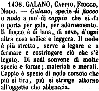 | Galano, Cappio, Fiocco, Nodo - Galano, specie di fiocco o nodo a mo' di cappio che si fa o porta per gala, per adornamento. Il fiocco è di lana, di neve, d'ogni altra cosa soffice e leggera. Il nodo è più stretto, serve a legare e a fermare e costringere ciò che s'è legato. Di nodi sonvene di molte specie e forme; materiali e morali. Cappio è specie di nodo corsoio che più si tira, più si stringe attorno all'oggetto che abbraccia. [immagine] |