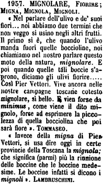 | Mignolare, Fiorire, Migna, Mignola, Mignoli - «Nel parlare dell'ulivo e de' suoi fiori... noi abbiamo due termini che non veggo si usino negli altri frutti. Il primo si è, che quando l'ulivo manda fuori quelle boccioline, noi chiamiamo nel nostro parlare questo moto della natura, mignolare. E poi quando quelle tali boccie s'aprono, diciamo gli ulivi fiorire.....Così Pier Vettori. Vive ancora nelle nostre campagne toscane cotesto mignolare, sì bello. E vien forse da minimus, come viene il dito mignolo, forse ad esprimere la piccolezza di quella bocciolina che poi sarà fiore». Tommaseo.