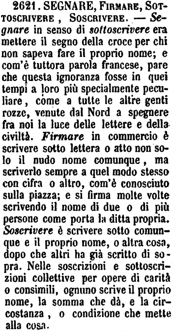 | Segnare, Firmare, Sottoscrivere, Soscrivere - Segnare in senso di sottoscrivere era mettere il segno della croce per chi non sapeva fare il proprio nome; e com'è tuttora parola francese, pare che questa ignoranza fosse in quei tempi a loro più specialmente peculiare, come a tutte le altre genti rozze, venute dal Nord a spegnere fra noi la luce delle lettere e della civiltà. Firmare in commercio è scrivere sotto lettera o atto non solo il nudo nome comunque, ma scriverlo sempre a quel modo stesso con cifra o altro, com'è conosciuto sulla piazza; e si firma molte volte scrivendo il nome di due o di più persone come porta la ditta propria. Soscrivere è scrivere sotto comunque e il proprio nome, o altra cosa, dopo che altri ha già scritto di sopra. Nelle soscrizioni e sottoscrizioni collettive per opere di carità o consimili, ognuno scrive il proprio nome, la somma che dà, e la circostanza, o condizione che mette alla cosa. [immagine] |