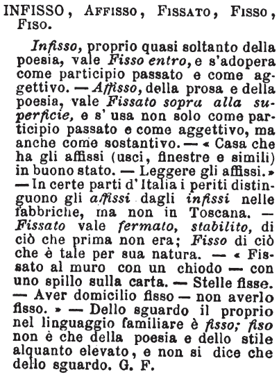 | Infisso, Affisso, Fissato, Fisso, Fiso - Infisso, proprio quasi soltanto della poesia, vale Fisso entro, e s'adopera come participio passato e come aggettivo. - Affisso, della prosa e della poesia, vale Fissato sopra alla superficie, e s'usa non solo come participio passato e come aggettivo, ma anche come sostantivo. - «Casa che ha gli affissi (usci, finestre e simili) in buono stato. - Leggere gli affissi.» - In certe parti d'Italia i periti distinguono gli affissi dagli infissi nelle fabbriche, ma non in Toscana. - Fissato vale fermato, stabilito, di ciò che prima non era; Fisso di ciò che è tale per sua natura. - «Fissato al muro con un chiodo - con uno spillo sulla carta. - Stelle fisse. - Aver domicilio fisso - non averlo fisso.» - Dello sguardo il proprio nel linguaggio familiare è fisso; fiso non è che della poesia e dello stile alquanto elevato, e non si dice che dello sguardo. G. F. [immagine] |
