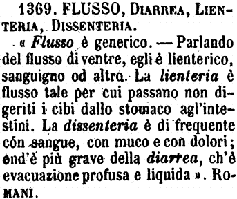 | Flusso, Diarrea, Lienteria, Dissenteria - «Flusso è generico. - Parlando del flusso di ventre, egli è lienterico, sanguigno od altro. La lienteria è flusso tale per cui passano non digeriti i cibi dallo stomaco agl'intestini. La dissenteria è di frequente con sangue, con muco e con dolori; ond'è più grave della diarrea, ch'è evacuazione profusa e liquida». Romani. [immagine] |