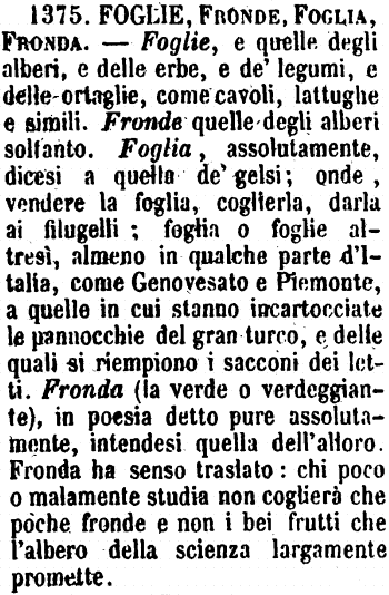 | Foglie, Fronde, Foglia, Fronda - Foglia, e quelle degli alberi, e delle erbe, e de' legumi, e delle ortaglie, come cavoli, lattughe e simili. Fronde quelle degli alberi soltanto. Foglia, assolutamente, dicesi a quella de' gelsi; onde, vendere la foglia, coglierla, darla ai filugelli; foglia o foglie altresì, almeno in qualche parte d'Italia, come Genovesato e Piemonte, a quelle in cui stanno incartocciate le pannocchie del gran turno, e delle quali si riempiono i sacconi dei letti. Fronda (la verde o verdeggiante), in poesia detto pure assolutamente, intendesi quella dell'alloro. Fronda ha senso traslato: chi poco o malamente studia non coglierà che poche fronde e non i bei frutti che l'albero della scienza largamente promette. [immagine] |