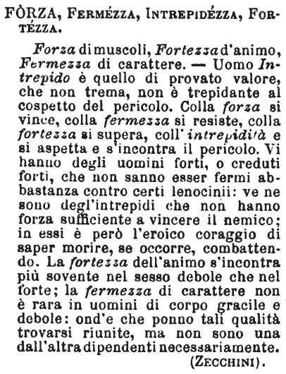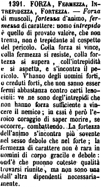 Forza, Fermezza, Intrepidezza, Fortezza - Forza di muscoli, Fortezza d'animo, Fermezza di carattere. - Uomo Intrepido è quello di provato valore, che non trema, non è trepidante al cospetto del pericolo. Colla forza si vince, colla fermezza si resiste, colla fortezza si supera, coll'intrepidità e si aspetta e s'incontra il pericolo. Vi hanno degli uomini forti, o creduti forti, che non sanno esser fermi abbastanza contro certi lenocinii: ve ne sono degl'intrepidi che non hanno forza sufficiente a vincere il nemico; in essi è però l'eroico coraggio di saper morire, se occorre, combattendo. La fortezza dell'animo s'incontra più sovente nel sesso debole che nel forte; la fermezza di carattere non è rara in uomini di corpo gracile e debole: ond'è che ponno tali qualità trovarsi riunite, ma non sono una dall'altra dipendenti necessariamente.