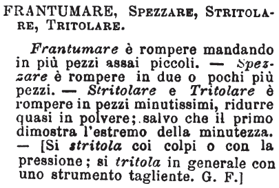| Frantumare, Spezzare, Stritolare, Tritolare - Frantumare è rompere mandando in più pezzi assai piccoli. - Spezzare è rompere in due o pochi più pezzi. - Stritolare e Tritolare è rompere in pezzi minutissimi, ridurre quasi in polvere; salvo che il primo dimostra l'estremo della minutezza. - [Si stritola coi colpi o con la pressione; si tritola in generale con uno strumento tagliente. G. F.] [immagine] |