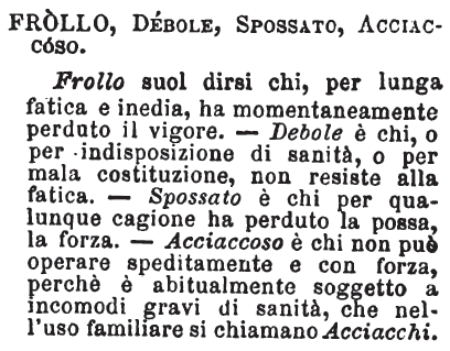| Frollo, Debole, Spossato, Acciaccoso - Frollo suol dirsi chi, per lunga fatica e inedia, ha momentaneamente perduto il vigore. - Debole è chi, o per indisposizione di sanità, o per mala costituzione, non resiste alla fatica. - Spossato è chi per qualunque cagione ha perduto la possa, la forza. - Acciaccoso è chi non può operare speditamente e con forza, perchè è abitualmente soggetto a incomodi gravi di sanità, che nell'uso familiare si chiamano Acciacchi. [immagine] |