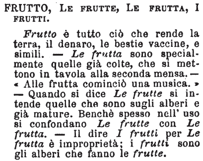 | Frutto, Le frutte, Le frutta, I frutti - Frutto è tutto ciò che rende la terra, il denaro, le bestie vaccine, e simili. - Le frutta sono specialmente quelle già colte, che si mettono in tavola alla seconda mensa. - «Alle frutta cominciò una musica.» - Quando si dice Le frutte si intende quelle che sono sugli alberi e già mature. Benchè spesso nell'uso si confondano Le frutte con Le frutta. - Il dire I frutti per Le frutta è improprietà; i frutti sono gli alberi che fanno le frutte. [immagine] |