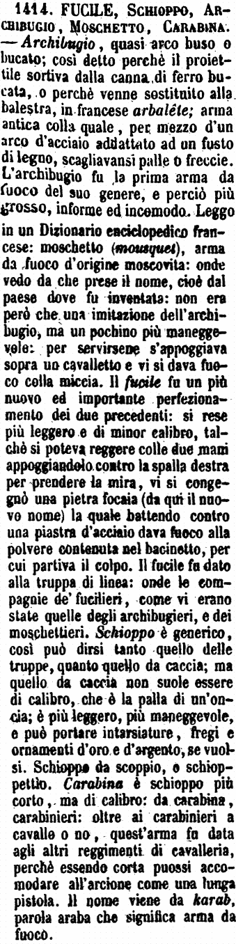 Carabina, Schioppo, Fucile - Lo Schioppo è voce generica delle armi da fuoco manevoli e da scaricarsi imbracciandole: dove la Carabina è un'arme speciale, benché dello stesso genere, più corta e di maggior portata dello schioppo. - Fucile lo dicono per quel medesimo che Schioppo, prendendo una parte per il tutto, dacché il Fucile era, negli schioppi a pietra, il punto dove si metteva la polvere, la quale si accendeva quando la pietra batteva sull'acciarino. - È ita in disuso la parola Moschetto, che pure era appellativo generico. - Da Carabina si origina Carabiniere; da Schioppo si trae Schioppettiere, ora fuor di uso; da Moschetto, Moschettiere, e Fuciliere da Fucile. Moschettare e Fucilare si disse il far morire altrui, dopo la data sentenza, sparandogli al petto più schioppj; il più comune è Fucilare. In niun caso per altro si direbbe Carabinare. [immagine]