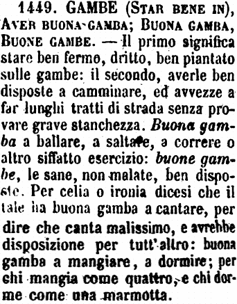 Gambe (star bene in), Avere buona gamba; Buona gamba, Buone gambe - Il primo significa stare ben fermo, dritto, ben piantato sulle gambe: il secondo, averle ben disposte a camminare, ed avvezze a far lunghi tratti di strada senza provare grave stanchezza. Buona gamba a ballare, a saltare, a correre o altro siffatto esercizio: buone gambe, le sane, non malate, ben disposte. Per celia o ironia dicesi che il tale ha buona gamba a cantare, per dire che canta malissimo, e avrebbe disposizione per tutt'altro: buona gamba a mangiare, a dormire; per chi mangia come quattro, e chi dorme come una marmotta. [immagine]