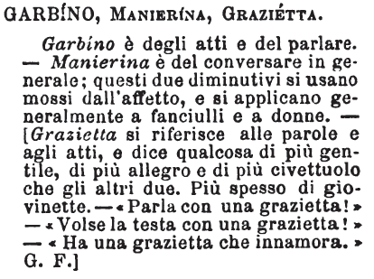 Garbino, Manierina, Grazietta - Garbìno è degli atti e del parlare. - Manierina è del conservare in generale; questi due diminutivi si usano mossi dall'affetto, e si applicano generalmente a fanciulli e a donne. - [Grazietta si riferisce alle parole e agli atti, e dice qualcosa di più gentile, di più allegro e di più civettuolo che gli altri due. Più spesso di giovinette. - «Parla con una grazietta!» - «Volse la testa con una grazietta!» - «Ha una grazietta che innamora.» G. F.] [immagine]