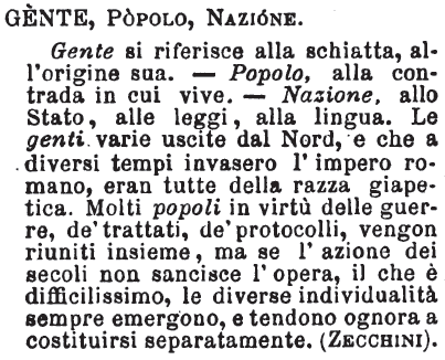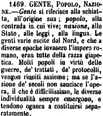 | Gente, Popolo, Nazione - Gente si riferisce alla schiatta, all'origine sua; popolo, alla contrada in cui vive; nazione, allo Stato, alle leggi, alla lingua. Le genti varie escite dal Nord, e che a diverse epoche invasero l'impero romano, eran tutte della razza giapetica. Molti popoli in virtù delle guerre, de' trattati, de' protocolli, vengon riuniti assieme; ma se l'azione de' secoli non sancisce l'opera, il che è difficilissimo, le diverse individualità sempre emergono, e tendono ognora a costituirsi separatamente. [immagine] |