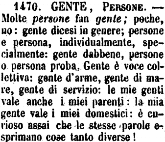 | Gente, Persone - Molte persone fan gente; poche, no: gente dicesi in genere; persone e persona, individualmente, specialmente: gente dabbene, persone o persona proba. Gente è voce collettiva: gente d'arme, gente di mare, gente di servizio: le mie genti vale anche i miei parenti: la mia gente vale i miei domestici: è curioso assai che le stesse parole esprimano cose tanto diverse! [immagine] |