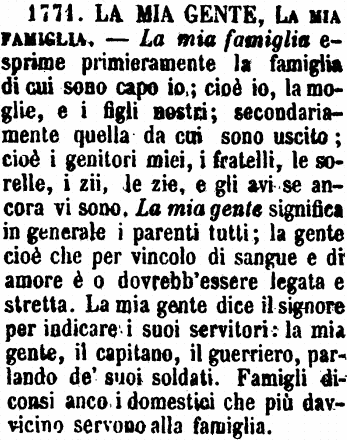 | La mia gente, La mia famiglia - La mia famiglia esprime primieramente la famiglia di cui sono capo io; cioè io, la moglie, e i figli nostri; secondariamente quella da cui sono uscito; cioè i genitori miei, i fratelli, le sorelle, i zii, le zie, e gli avi se ancora vi sono. La mia gente significa in generale i parenti tutti; la gente cioè che per vincolo di sangue e di amore è o dovrebb'essere legata e stretta. La mia gente dice il signore per indicare i suoi servitori: la mia gente, il capitano, il guerriero, parlando de' suoi soldati. Famigli diconsi anco i domestici che più davvicino servono alla famiglia. [immagine] |