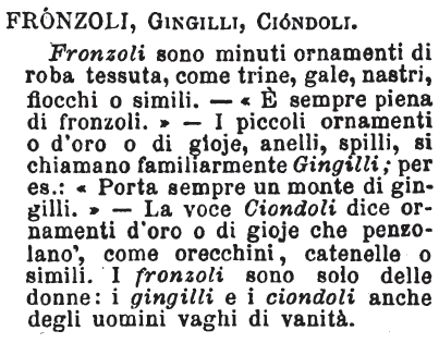 | Fronzoli, Gingilli, Ciondoli - Fronzoli sono minuti ornamenti di roba tessuta, come trine, gale, nastri, fiocchi o simili. - «E' sempre piena di fronzoli.» - I piccoli ornamenti o d'oro o di gioje, anelli, spilli, si chiamano familiarmente Gingilli; per es.: «Porta sempre un monte di gingilli.» - La voce Ciondoli dice ornamenti d'oro o di gioje che penzolano, come orecchini, catenelle o simili. I fronzoli sono solo delle donne: i gingilli e i ciondoli anche degli uomini vaghi di vanità. [immagine] |