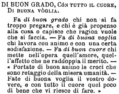 | Di buon grado, Di buon cuore, Di buona voglia - Fa di buon grado chi non si fa troppo pregare, e chi è già propenso alla cosa, o capisce che ragion vuole che si faccia. Fa di buona voglia chi lavora con animo e con una certa soddisfazione. Fa di buon cuore chi mette nell'opera quell'amore, quell'affetto che ne addoppia il merito. Portate di buon animo le croci che sono retaggio della misera umanità; fate di buona voglia il vostro dovere, e di buon cuore quel poco bene che vi riesce di fare. [immagine] |