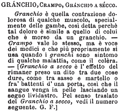 | Granchio, Crampo, Granchio a secco - Granchio è quella contrazione dolorosa di qualche muscolo, specialmente delle gambe, così detta perchè tal dolore è simile a quello di colui che è morso da un granchio. - Crampo vale lo stesso, ma è voce dei medici e che più propriamente si usa quando i granchi sono sintomo di qualche malattia, come il colèra. - [Granchio a secco è l'effetto del rimaner preso un dito tra due cose dure, come tra sasso e martello o fra' battenti d'una porta, così che il sangue venga in pelle lasciando un segno lividastro. Per senso traslato del Granchio a secco, vedi il numero seguente. G. F.] [immagine] |