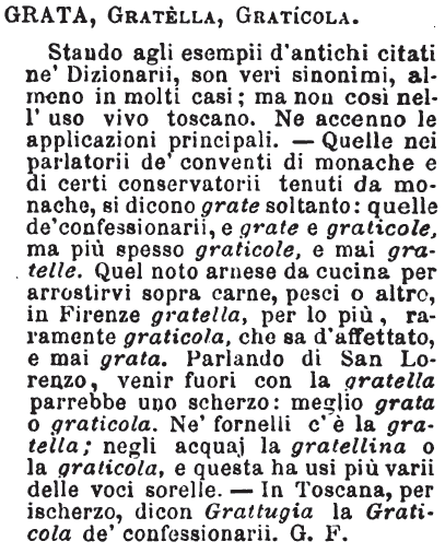 | Grata, Gratella, Graticola - Stando agli esempii d'antichi citati ne' Dizionari, son veri sinonimi, almeno in molti casi; ma non così nell'uso vivo toscano. Ne accenno le applicazioni principali. - Quelle nei parlatorii de' conventi di monache e di certi conservatorii tenuti da monache, si dicono grate soltanto: quelle de' confessionarii, e grate e graticole, ma più spesso graticole e mai gratelle. Quel noto arnese da cucina per arrostirvi sopra carne, pesci o altro, in Firenze gratella, per lo più, raramente graticola, che sa d'affettato, e mai grata. Parlando di San Lorenzo, venir fuori con la gratella parrebbe uno scherzo: meglio grata o graticola. Ne' fornelli c'è la gratella; negli acquaj la gratellina o la graticola, e questa ha usi più varii delle voci sorelle. - In Toscana, per ischerzo, dicon Grattugia la Graticola de' confessionarii. G.F. [immagine] |