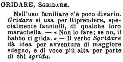 | Gridare, Sgridare - Nell'uso familiare c'è poco divario. Gridare si usa per Riprendere, specialmente fanciulli, di qualche loro marachella. - « Non lo fare; se no, il babbo ti grida.» - Il verbo Sgridare dà idea per avventura di maggiore sdegno, e di voce più alta per parte di chi sgrida. [immagine] |