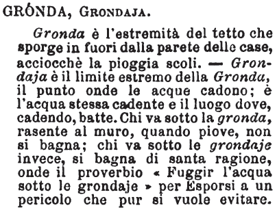 | Gronda, Grondaja - Gronda è l'estremità del tetto che sporge in fuori dalla parete delle case, acciocchè la pioggia scoli. - Grondaja è il limite estremo della Gronda, il punto onde le acque cadono; è l'acqua stessa cadente e il luogo dove, cadendo, batte. Chi va sotto la gronda, rasente al muro, quando piove, non si bagna; chi va sotto le grondaje invece, si bagna di santa ragione, onde il proverbio «Fuggir l'acqua sotto le grondaje» per Esporsi a un pericolo che pur si vuole evitare. [immagine] |