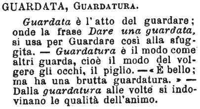 | Guardata, Guardatura - Guardata è l'atto del guardare; onde la frase Dare una guardata, si usa per Guardare così alla sfuggita. - Guardatura è il modo come altri guarda, cioè il modo del volgere gli occhi, il piglio. - «E' bello; ma ha una brutta guardatura.» - Dalla guardatura alle volte si indovinano le qualità dell'animo. [immagine] |