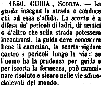 | Guida, Scorta - La guida insegna la strada e conduce chi ad essa s'affida. La scorta è a difesa de' pericoli di ladri, di nemici o d'altro che sulla strada potessero incontrarsi: la guida deve conoscere bene il cammino, la scorta vigilare contro i pericoli lungo la via: se l'uomo ha la prudenza per guida e per iscorta la fermezza, può camminare risoluto e sicuro nelle vie sdrucciolevoli del mondo. [immagine] |