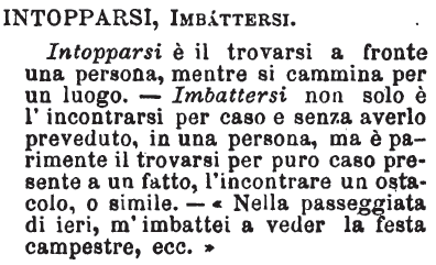 | Intopparsi, Imbattersi - Intopparsi è il trovarsi a fronte una persona, mentre si cammina per un luogo. - Imbattersi non solo è l'incontrarsi per caso e senza averlo preveduto, in una persona, ma è parimente il trovarsi per puro caso presente a un fatto, l'incontrare un ostacolo, o simile. - «Nella passeggiata di ieri, m'imbattei a veder la festa campestre, ecc.» [immagine] |