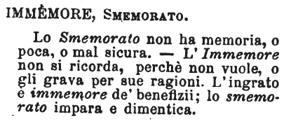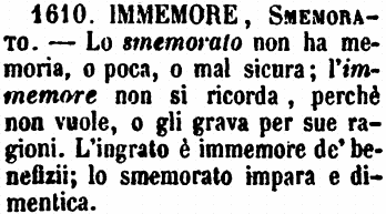 | Immemore, Smemorato - Lo smemorato non ha memoria, o poca, o mal sicura; l'immemore non si ricorda, perchè non vuole, o gli grava per sue ragioni. L'ingrato è immemore de' benefizii; lo smemorato impara e dimentica. [immagine] |